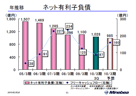 第3四半期末のネット有利子負債は1,028億円と、前期末から72億円の減少でした。前四半期比では、中間配当金の支払いやE-Ship導入による支払いに加え、年末のボーナスの支払いがあったものの、純利益が増加したことと設備投資抑制により現預金が増えたため8億円の減少となりました。また、第3四半期累計のフリーキャッシュフローは87億円となりました。今後とも引続きキャッシュフロー創出に注力してまいります。一方で、経営環境を総合的に判断し、積極的なM&Aや株主還元策なども引き続き検討、実施してまいります。