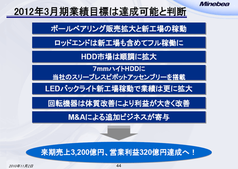 一つ目はボールベアリングの販売拡大と新工場稼動です。二つ目はロッドエンドのフル稼働です。三つ目はHDD市場は来年も順調に拡大するだろうと思います。それから今期中に納入がスタートしますが、7mmハイトHDD向けのスリーブレスピボットアッセンブリーの承認をお客様から受けています。その製品の特許も持っています。これを中心に7mmハイトHDDへの主力供給者になりたいと思っています。LEDバックライトは来期に月産3,000万個体制になります。回転機器は体質改善により利益が大きく改善します。数字にまとめると、私のラフなイメージとしては、回転機器で約30億円、スライドのLEDバックライトより上の項目で20億円、それ以外にもM&Aによる追加ビジネスが寄与するであろうと思っています。開示は出来ませんが、常に私共はM&Aの検討案件を抱えています。こういった形で、来期は売上高3,200億円、営業利益320億円の達成を狙っていきたいと思います。その中で下半期を捉え、今期の通期営業利益予想250億円を皆様にお示しした訳です。