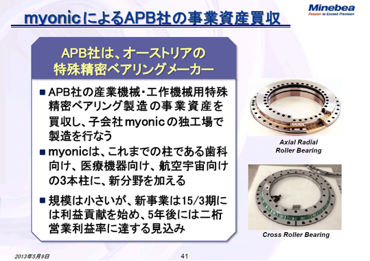 マイオニックはAPBという会社の事業資産を買いました。一番得意とする技術は工作機械のターンテーブルのベアリングで、内径が80~800mm位のものです。ヨーロッパ市場での高精密AXベアリングの年間の市場規模は80億円ほどと聞いています。
