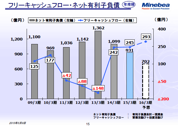 このグラフは、有利子負債総額から現預金を差し引いたネット有利子負債とフリーキャッシュフローの推移です。