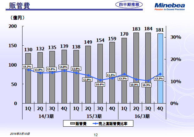 販管費は、前四半期期比3億円減少し、181億円となりました。しかし為替の影響がマイナス3億円あるため、減少分のほとんどがこの影響です。一方、売上高販管費比率については、売上減少の影響で前四半期比で3.0ポイント上昇し13.3%となりました。