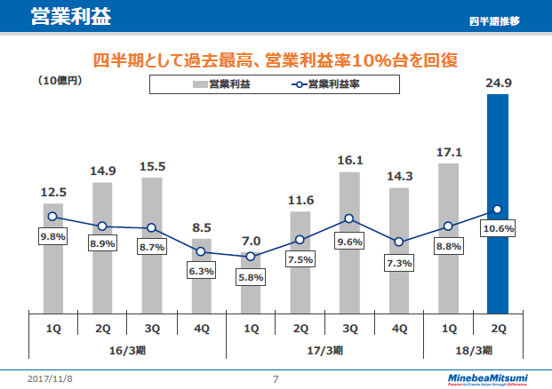 ご覧いただけますように、四半期として過去最高を更新するとともに、営業利益率は10.6%と二桁を超えました。