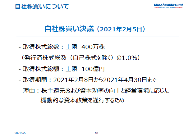 自社株買いは5月(期末決算)に発表したほうがよいのではという議論も社内でありましたが、私は今がその時期だと考えました。将来を確実に予想することは不可能ですが、明るい未来を前提とした我々の想定する企業価値に対して足元の株価は割安で、大きな開きがあのではないかと考えます。取得価額の総額は100億円と決議いたしましたが、その理由については次のページをご覧ください。