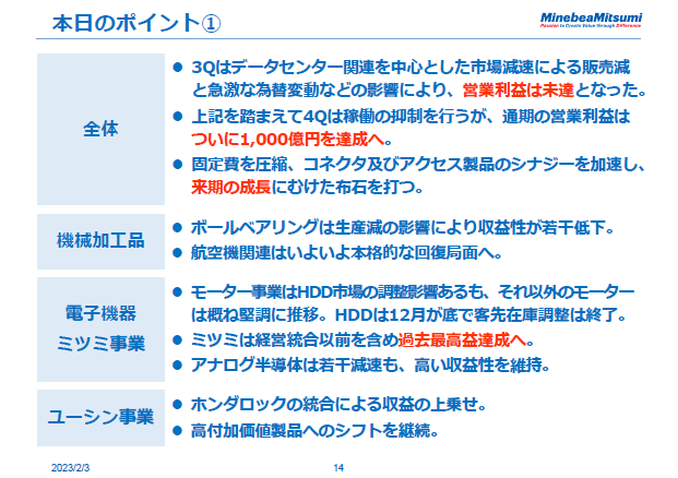 3Qは、10-11月は堅調だったものの、12月に突然のスローダウンがありました。ベアリング、HDD向けモーター、バックライト、半導体、ゲーム、OISなど、程度の差はあるものの、当社の収益基盤がおしなべてスローダウンしてしまった状態でした。