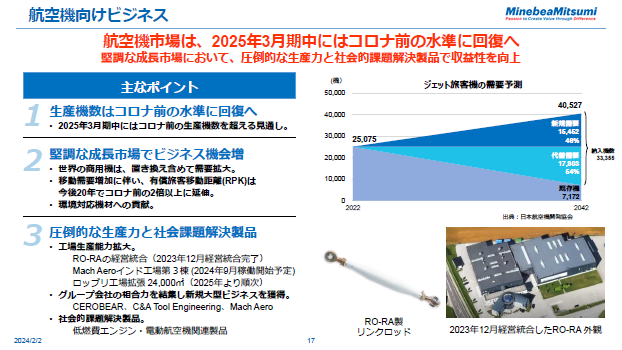 航空機向けは順調に推移しており、コロナ前の水準に回復してきています。特にシングルアイルはほぼ回復しており、ダブルアイルについても来年の夏前を目途に回復するという客先からの内示も出始めています。これらを踏まえてRO-RAという会社を買収しました。スライドに写真があるリンクロットと、ロッドエンドを組み合わせて垂直統合でお客様に販売します。現在、様々な国で航空機向けビジネスの生産工場の確保または準備を行っており、このような製品が加わることで、我々の航空機ビジネスをさらに拡大できると考えています。