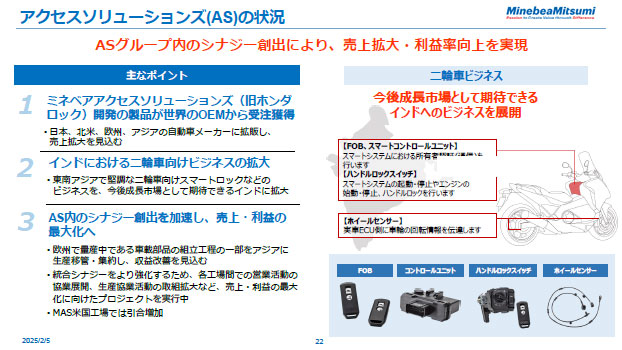 アクセスソリューションズ(AS)は、170億円の営業利益を出すと皆様にお約束し、当初は保守的な数字を出したつもりでしたが、この一年間で中国市場は土砂降りとなり、中国市場で計上していた利益は 1/3程度になってしまいました。ただ、これは当社の強みですが、米国工場の生産性が大きく向上し、赤字から黒字に転換し、収益が減った分をカバーしてくれました。米国工場はずっと赤字でしたが、素晴らしい黒字を出すようになり、歩留りも格段に上がっています。ここは旧ホンダロックですので、ホンダ様の仕事だけをやっていたのですが、ついに米国の自動車メーカーからの注文も入りました。トランプ政権誕生の影響により、様々な引き合いをいただき始めています。欧州も赤字でしたが、現時点で約20億円スイングしました。従って、中国で大きく落ち込んだ分、またその他の世界各地で落ち込んだ分を、米国と欧州の収益改善である程度カバーできたことで、私としては率直に申し上げて誇れる利益なのではないかと思っています。これからも我々が当初想定していた技術の進歩、様々なアクセス製品の電装化が間違いなく進んでまいりますし、面白いプロジェクトがどんどん立ち上がってまいりますので、是非ご期待いただければと思います。