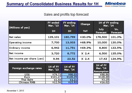 Looking at consolidated business results for the first half of the fiscal year ending March 31, 2014, we see that net sales were up 30.0% year on year to total 180,799 million yen. Operating income climbed 68.9% year on year to reach 13,003 million yen while net income hit 8,772 million yen, 2.4 times what it was a year ago.