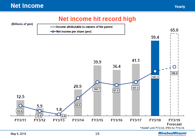 Net income rose 44% year on year to reach a record-high 59.4 billion yen. Net income per share was 141.1 yen.