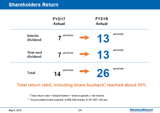 As we explained at the second quarter financial results briefing last November, we significantly increased our dividend to 26 yen per share in the fiscal year ended March 31, 2018.