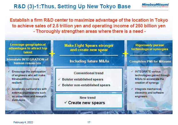 Another objective is, of course, to complete the PMI with Mitsumi. There are more than 600 employees from Mitsumi divisions remaining at the Tama office, about 600 at the Mita head office, and a little over 600 sales people at nearby buildings, totaling just under 2,000 employees. I believe it is my job to bring everyone together into a unified company.