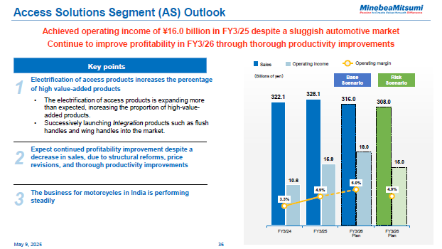 In the base scenario, we expect operating income of 19 billion yen. We are steadily incorporating new electrical components, centering on the wing handles that we have introduced many times. These are different from door handles and door locks we have produced previously. They are one-of-a-kind that only we can produce, and the change in product mix is as we expect at this point.