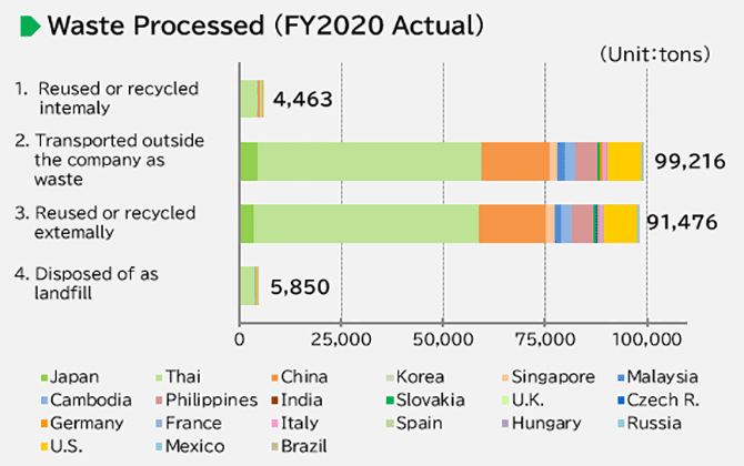 At our mass production plants in Thailand and China, we are recycling water inside the plants to the greatest extent possible and prevent external emissions through our "Plant Wastewater Zero System."