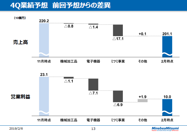 営業利益においては、機械加工品事業セグメントは中国における需要減速の影響、電子機器事業およびミツミ事業は中国の減速に加えて、主にスマートフォン、ゲームの落ち込みにより、前回想定を下回る見込みです。特にスマホ関連事業については急減産となったことから、在庫増と、人員の調整が追い付かなかったこと等による生産工場での非稼働損が発生することを見込んでいます。
