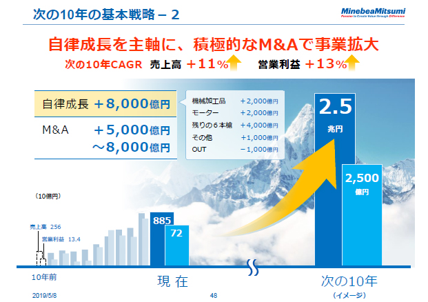 そうやって考えてきますと、10年後の我々の売上は2.5兆円ぐらいになるのかなと思っています。過去の10年で売上で5,000億円のM&Aをやったわけですから、土台が1兆円で、今言ったような状況の中で5,000億~8,000億のM&Aをやることはそれほど非現実的なことではないだろうと。それから自律的成長は、先ほど申し上げましたように2,300億だったものが5,000億になった前例を考えますと、2倍まではいかなくても1.8倍ぐらいにはできるのではないかと思います。ブレイクダウンとしては、機械加工品で2,000億、モーターで2,000億、残りの6本槍あるいは新製品で5,000億円、これを10年間でやっていこうと思っています。