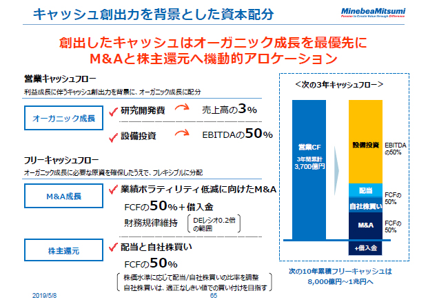 創出したEBITDAの半分は成長投資として設備投資に回します。また、長期的には、創出したフリーキャッシュフローの50%を株主還元に充当していきたいと考えています。その方法はいくつかありますが、先ほど発表しました自社株買いもそのうちの1つですし、配当を増やすことも1つです。それから、先ほどから申し上げているような、この10年でやってきたような本当に実効性のあるM&Aにも、投資していきたいと考えます。