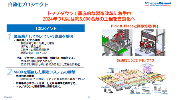 なかなか生産の自動化が進まないというご指摘を受けることもあったのですが、ついに着手することができ、東京クロステックガーデンにロボットフロアをつくりました。様々なトライアルを重ね、どのようにラインに投入していくか検討しています。まず、2024年3月までは6,000名分の省人化に取り組み、順次単純作業を中心に各工程の自動化に取り組んでいきます。2026年3月期までは累計13,000名分の工程を自動化する計画です。賃金の上昇もあり、各国で人の採用も難しくなっていきますが、長年の構想をようやく実施できる段階となりました。