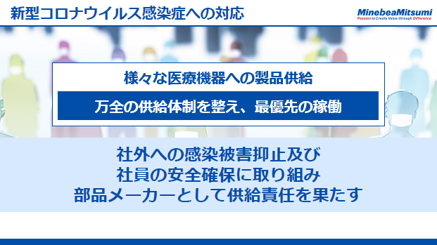 今後も社外への感染被害抑止及び社員の安全確保に取り組むとともに、生産・営業活動を含む事業活動全般において、部品メーカーとして供給責任を果たしてまいります。