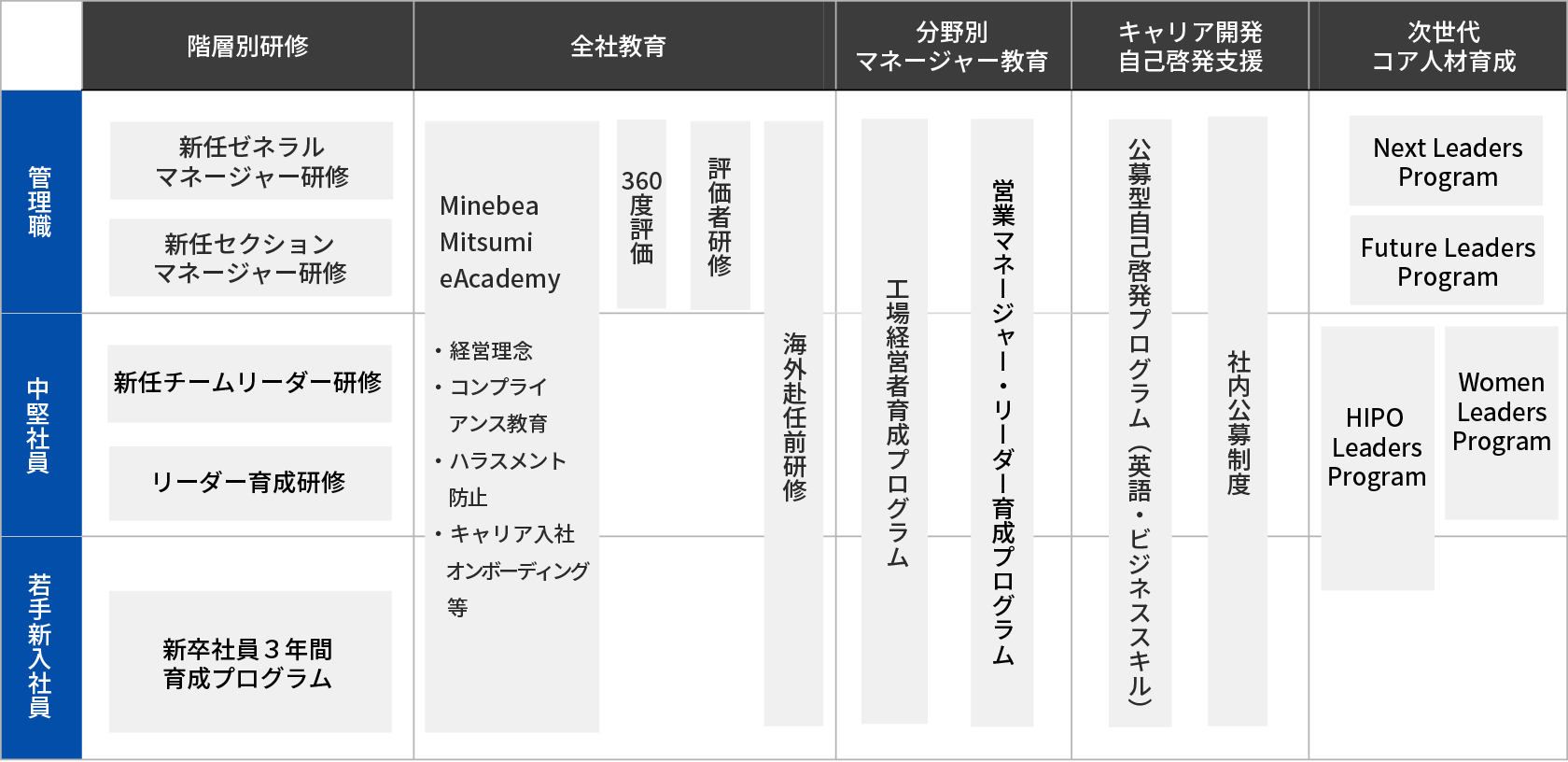 各役職別に実施する階層別研修や海外赴任前の研修、そして英語力強化をはじめとする自己啓発サポートなど、社員一人ひとりが成長し、活躍していくための教育・研修制度を整備しています。
