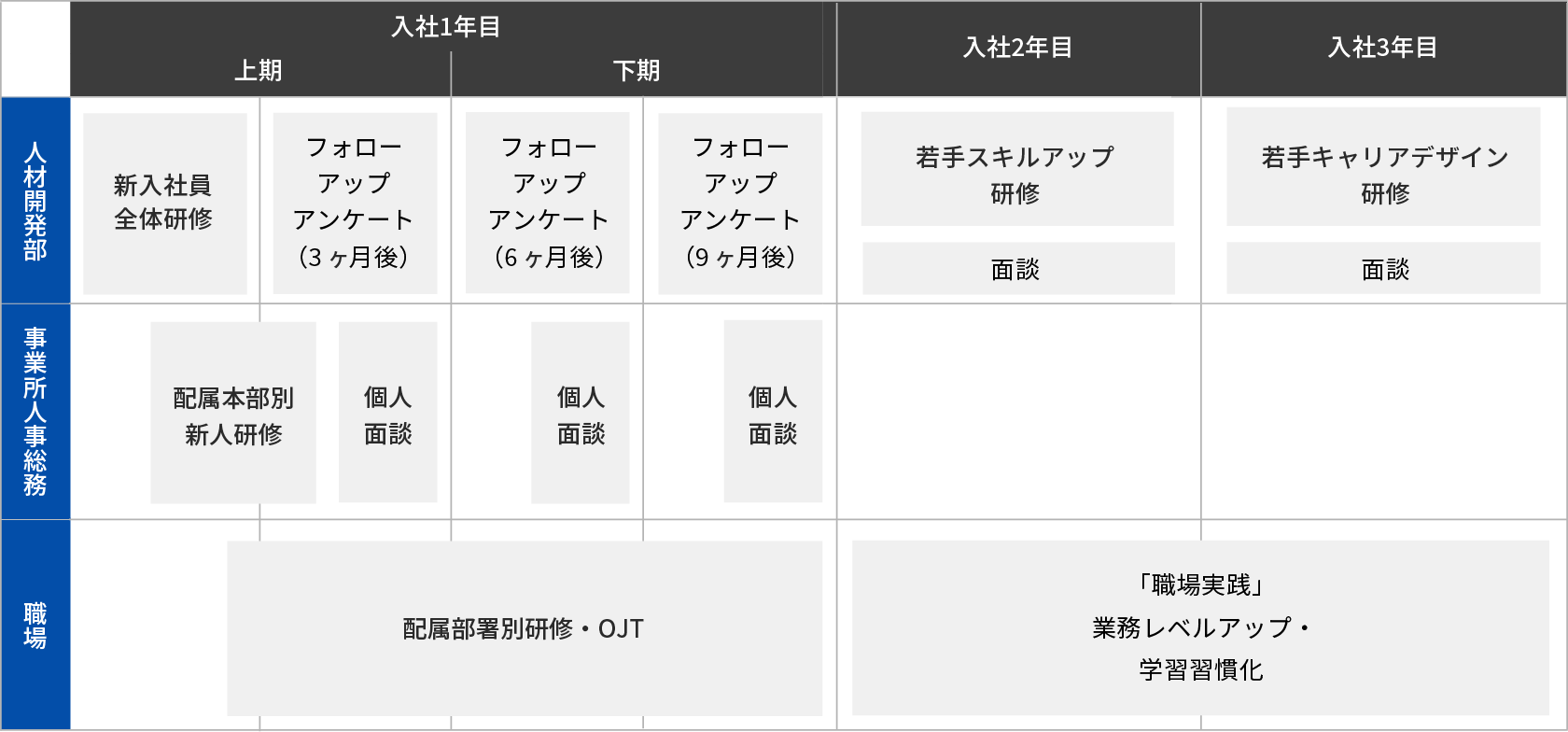 入社から3年間を育成期間と位置づけ、各部署と人材開発部が連携をして、必要な知識やスキルを習得する研修やOJT(On the Job Training)を実施します。自ら考え、判断し、行動できる、自立した従業員に早期に成長できるようにサポートを行います。