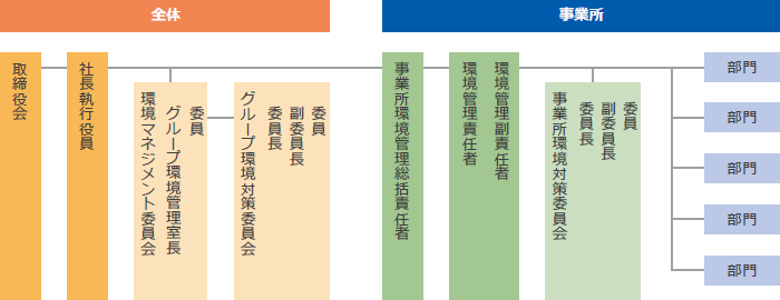 ミネベアミツミグループでは、「ミネベアミツミグループ環境方針」を実践するために、取締役会、社長執行役員をトップとした環境マネジメント体制を構築しています。全体の推進組織として、役員を中心とした「環境マネジメント委員会」と実務者による「グループ環境対策委員会」を設置し、環境政策について迅速に対応できる体制としています。また、各事業所に事業所環境管理総括責任者と環境管理責任者を配し、工場、事業所ごとに具体的な環境保全活動を推進しています。