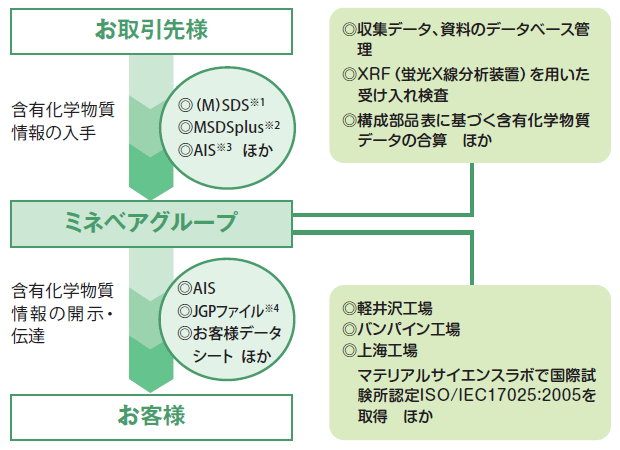 ミネベアグループが生産、販売する製品は、開発・設計段階から各国の環境法令やお客様の環境要求事項に従うだけでなく、自主的にも製品含有化学物質調査や製品アセスメントなどを行っている「環境配慮製品」です。