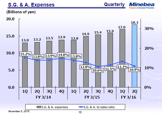 Second quarter SG&A expenses rose 1.3 billion yen from the previous quarter to total 18.3 billion yen due to a huge jump in sales. However, the SG&A expenses-to-sales ratio dropped 2.4 percentage points from the previous quarter and at 10.9% is almost at the lowest point it has ever been in recent years.