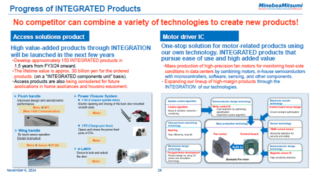 This page shows only two examples of our products, but there are many more. Under the slogan "INTEGRATION*," we have been educating our employees that this is the only way forward for us, and we have finally completed a driver IC that can be used not only for one type of motor driver, but also for various types of motors. We will continue to develop more and more products like this, and we believe that "INTEGRATION capabilities" will increasingly become the driver of our future growth.