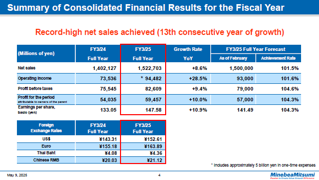 Consolidated net sales for the fiscal year ended March 31, 2025, increased by 8.6% year on year, totaling 1,522,703 million yen. Operating income increased by 28.5% year on year, totaling 94,482 million yen.