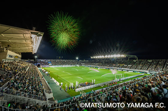 Since Honda Tsushin Kogyo signed a sponsorship contract with Matsumoto Yamaga FC, matches held during the summer vacation period have been designated "HTK Honda Tsushin Kogyo Day" and this year marked the 12th consecutive year. The local people know the event as "Alwin Fireworks," and 200 fireworks were launched at halftime to light up the night sky over Matsumoto City.