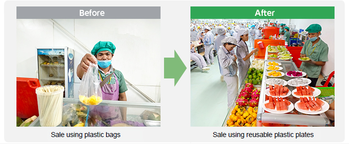 Approximately 9,000 local employees undertook bottom-up measures with high environmental awareness, changing the sale of fruits at its cafeteria from using disposable plastic bags to reusable plastic plates in March 2019. This reduced plastic bag use by approximately 160,000 bags—or a weight of 312 kg—per month. Going forward, the use of bamboo straws and reusable plastic cups is also being considered, with plans to further reduce plastic waste by 100,000 units per month.