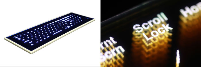 (As for this photograph, a lattice lamp in the upper part of the exhibition box is reflected on the surface of the flat panel because the keys are not shining at this point.)