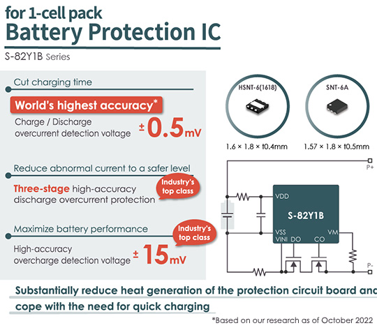 The new S-82Y1B Series of 1-cell lithium-ion battery protection ICs launched today is the upgraded version of our S-82P1 Series. The new ICs (1) raise the charge-discharge overcurrent detection voltage accuracy from ±0.75mV of the S-82P1 Series to the world's highest accuracy of ±0.5mV and suppress overcurrent detection variations while lowering current detection resistance, (2) provide three-stage discharge overcurrent protection, each stage of which ensures the industry's top class accuracy capable of reducing abnormal current to an even safer level, and (3) also boast the industry's top class overcharge detection voltage accuracy of ±15mV.