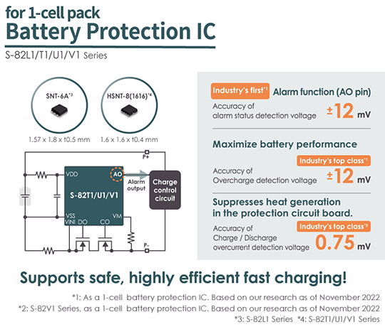 ABLIC (President: Nobumasa Ishiai, head office: Minato-ku, Tokyo hereinafter "ABLIC"), a group company of MinebeaMitsumi Inc. today launched the S-82L1/T1/U1/V1 Series, the industry's first (*1) 1-cell battery protection ICs with an alarm function.