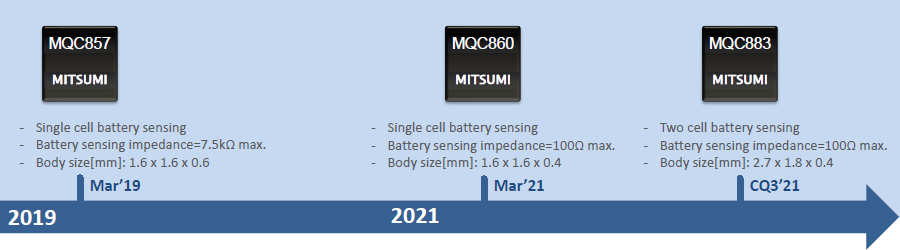 MinebeaMitsumi is the world's leading supplier of 1-cell lithium-ion battery protection IC and MQC857 that we developed in 2018, and is the first product compatible with Qualcomm® Quick Charge™ technology, currently used for many high-end smartphones.