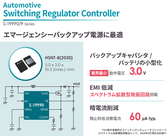 ミネベアミツミグループのエイブリック株式会社(社長:田中 誠司、本社:東京都港区、以下:ABLIC)は本日より、車載用昇圧型スイッチングレギュレータコントローラ「S-19990/9シリーズ」の販売を開始しました。